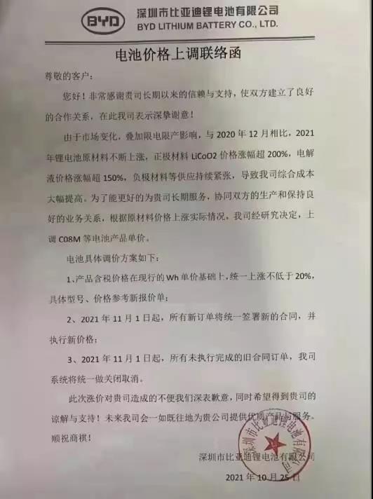 深圳市比亞迪鋰電池有限公司電池價格上調(diào)聯(lián)絡函尊敬的客戶:您好!非常感謝貴司長期以來的信賴與支持,使雙方建立了良好的合作關系,在此我司表示深摯謝意!由于市場變化,疊加限電限產(chǎn)影響,與2020年12月相比,2021年鋰電池原材料不斷上漲,正極材料LiCoO2價格漲幅超200%,電解液價格漲幅超150%,負極材料等供應持續(xù)緊張,導致我司綜合成本大幅提高。為了能更好的為貴司長期服務,協(xié)同雙方的生產(chǎn)和保持良好的業(yè)務關系,根據(jù)原材料價格上漲實際情況,我司經(jīng)研究決定,上調(diào)C08M等電池產(chǎn)品單價。電池具體調(diào)價方案如下:1、產(chǎn)品含稅價格在現(xiàn)行的Wh單價基礎上,統(tǒng)一上漲不低于20%,具體型號、價格參考新報價單:2、2021年11月1日起,所有新訂單將統(tǒng)一簽署新的合同,并執(zhí)行新價格;3、2021年11月1日起,所有未執(zhí)行完成的舊合同訂單,我司系統(tǒng)將統(tǒng)一做關閉取消。此次漲價對貴司造成的不便我們深表歉意,同時希望得到貴司的諒解與支持!未來我司會一如既往地為貴公司提供優(yōu)質(zhì)產(chǎn)品與服務。順祝商祺!深圳市比亞迪鋰電池有限公司2021年10月25日