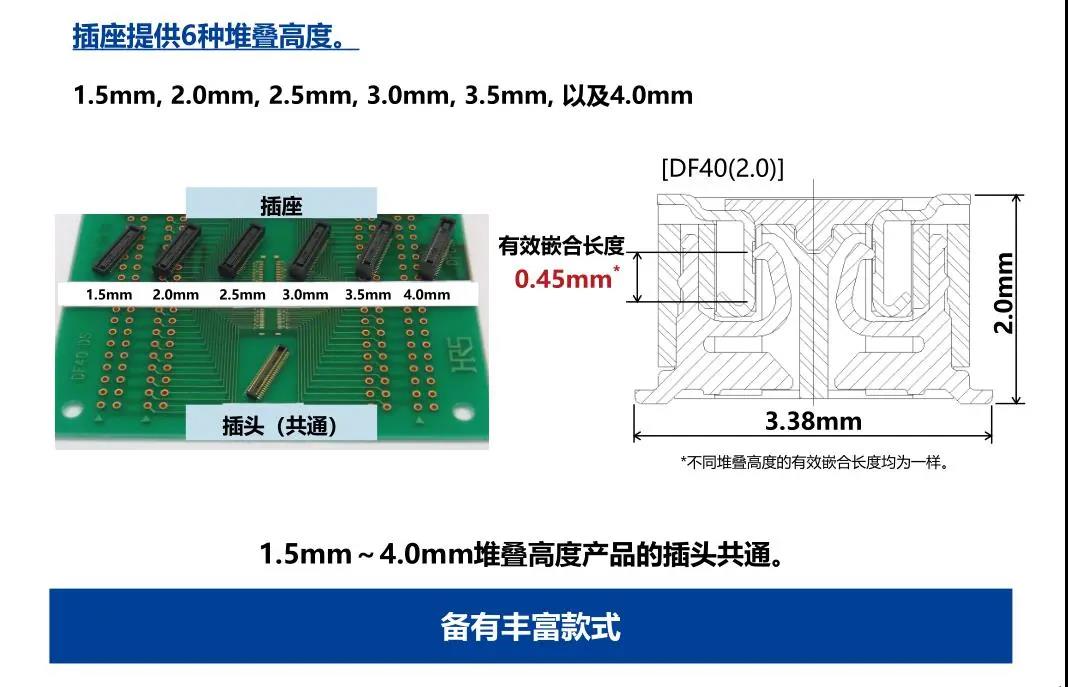 特點 1. 省空間:縱深3.38mm 2. 堆疊高度 1.5-4.0mm 3. 對應USB4 Gen.2(10Gbps)信號傳輸 *1 4. 有效嵌合長度長:0.45mm 5. 卓越的端子構造實現(xiàn)了明確的鎖扣手感以及大嵌合力 6. 防止端子變形構造 7. 種類繁多(帶護罩:DF40G系列,帶完全鎖:DF40GL系列,ADAS:DF40T系列) 8.核心數(shù)量從10到120核心變化巨大 9.用導向肋確保自動對準:0.33mm 10.防止鎳阻擋層焊接的結構 11.還提供用于生產(chǎn)線檢查的高度耐用的連接器* 只有H=1.5 mm的產(chǎn)品支持Type-C DF40系列變體