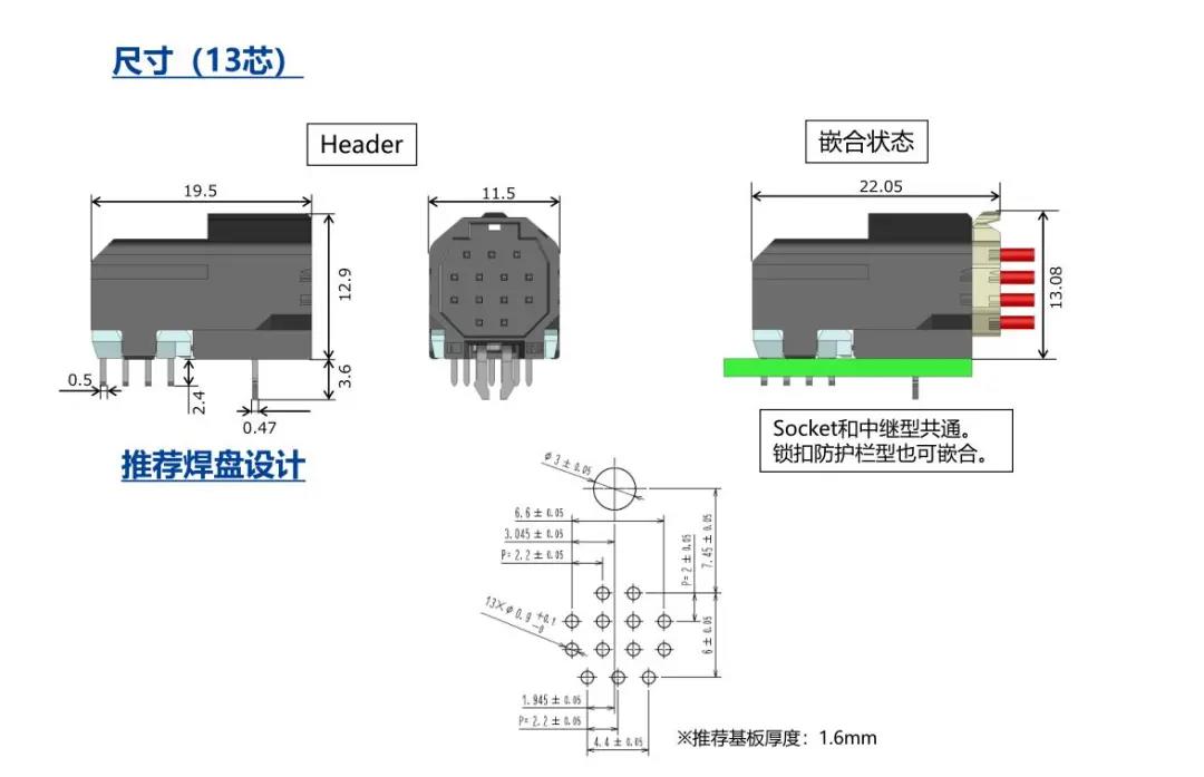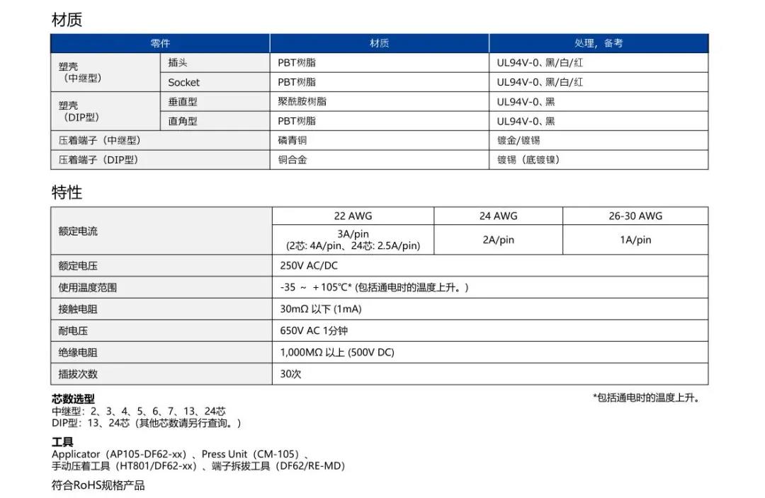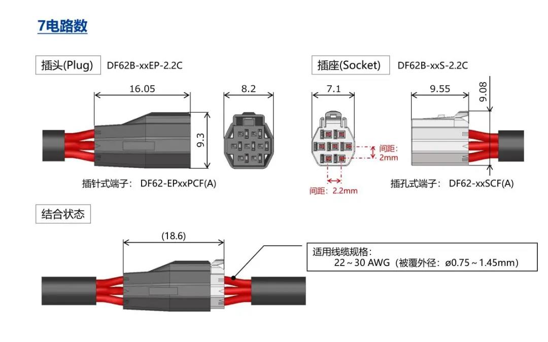 特點 [SignalBee?] 2 x 2.2 mm間距 用于狹小空間纖細型中繼連接器(UL C-UL認證產品) 1. 纖細光滑的外形適合狹窄空間的布線 2. 清晰的鎖扣感和目視可確認是否鎖定 3. 可靠的接觸結構 4. 堅固的端子結構 5. 芯數(shù)選型:2、3、4、5、6、7、13、24 DF62B:標準型 DF62C:鎖加部保護強化型 DF62P:面板安裝型 6. 可與DF11/DF59系列共用自動壓著設備 7. 防冷凝措施(防水型DF62W) 細小