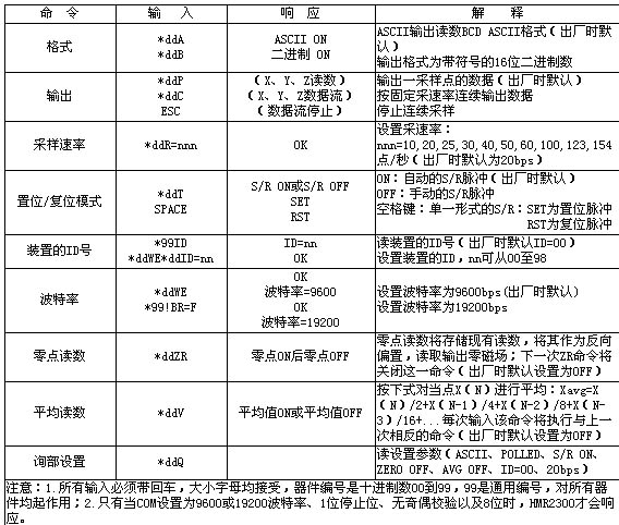 HMR2300可以通過簡單的命令與磁場計進行通訊,這些命令可通過標準鍵盤和任何通訊軟件(如Windows中的超級終端)輸入。表2為HMR2300的輸入命令集。