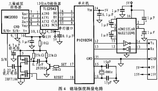 圖4是一個使用HMC2003磁敏傳感器、12位A/D轉換器、PIC16C54單片機、RS232接口和置位/復位電路構成的三維磁場測量電路。