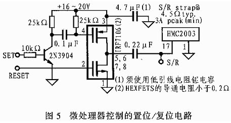 圖5是一種可在微處理器的控制下產生大于4A的置位/復位強脈沖電路圖。利用該電路可在微處理器的控制下產生置位和復位信號以控制HEXFET驅動器(IRF706)的P和N通道。引入TRS和TSR延時的目的是確保在一個HEXFET開通之前使另 個HEXFET閉合,這類似一個先開后保的開關接點。利用這一開關可在4.7μF電容和脈沖輸出點之間串接一個500Ω的分壓電阻。如果不使用微處理器,也可用時鐘信號來觸發置位和復位信號。