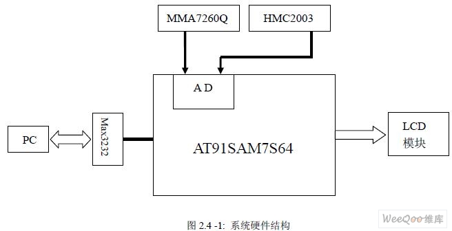 本系統(tǒng)的硬件結構如圖2.4 -1 所示。 由于At91sam7s64 具有片上A/D 轉(zhuǎn)換器而且具有8 選1 模擬復用器,使得MMA7620Q 和HMC2003 可以直接與微控制器相連而不必外加A/D 轉(zhuǎn)換器和復用器,不僅降低了系統(tǒng)的 成本和體積,提高了系統(tǒng)的集成度,同時減少了誤差源,提高了精度。經(jīng)過A/D 轉(zhuǎn)換的測量數(shù)據(jù)經(jīng)過ARM 核的處理后,被送到串口LCD 并通過RS232 接口送入PC 機進行進一步 的分析。