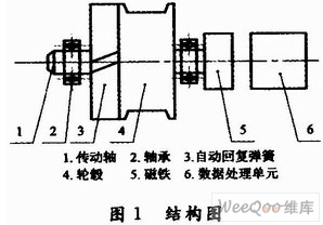 基于磁敏角度技術(shù)的拉線式位移傳感器的功能是將拉線的機(jī)械位移換成可以計量、記錄或傳送的電信號,主要由自動回復(fù)彈簧、輪轂、磁鐵以及數(shù)據(jù)處理單元等部分構(gòu)成,結(jié)構(gòu)如圖1所示。